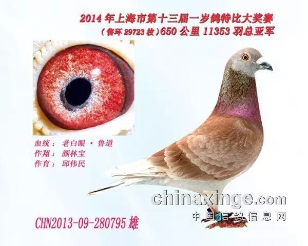 其四,ZZ型(纯合体绛雄)不太择配,融血性能亦好,与无血缘关系的鸽子配对比较容易成功,据此获得杂交优势,创作出铭翅良羽。但是我得提醒鸽友,优质的纯合体绛雄是不易买到的,你也不会相信别人会给你纯合体绛鸽,所以得靠你自己,你得学会选用优质材料进行育种。养鸽子不会育种,那会少了许多乐趣,还会多花了许多冤枉银子。
