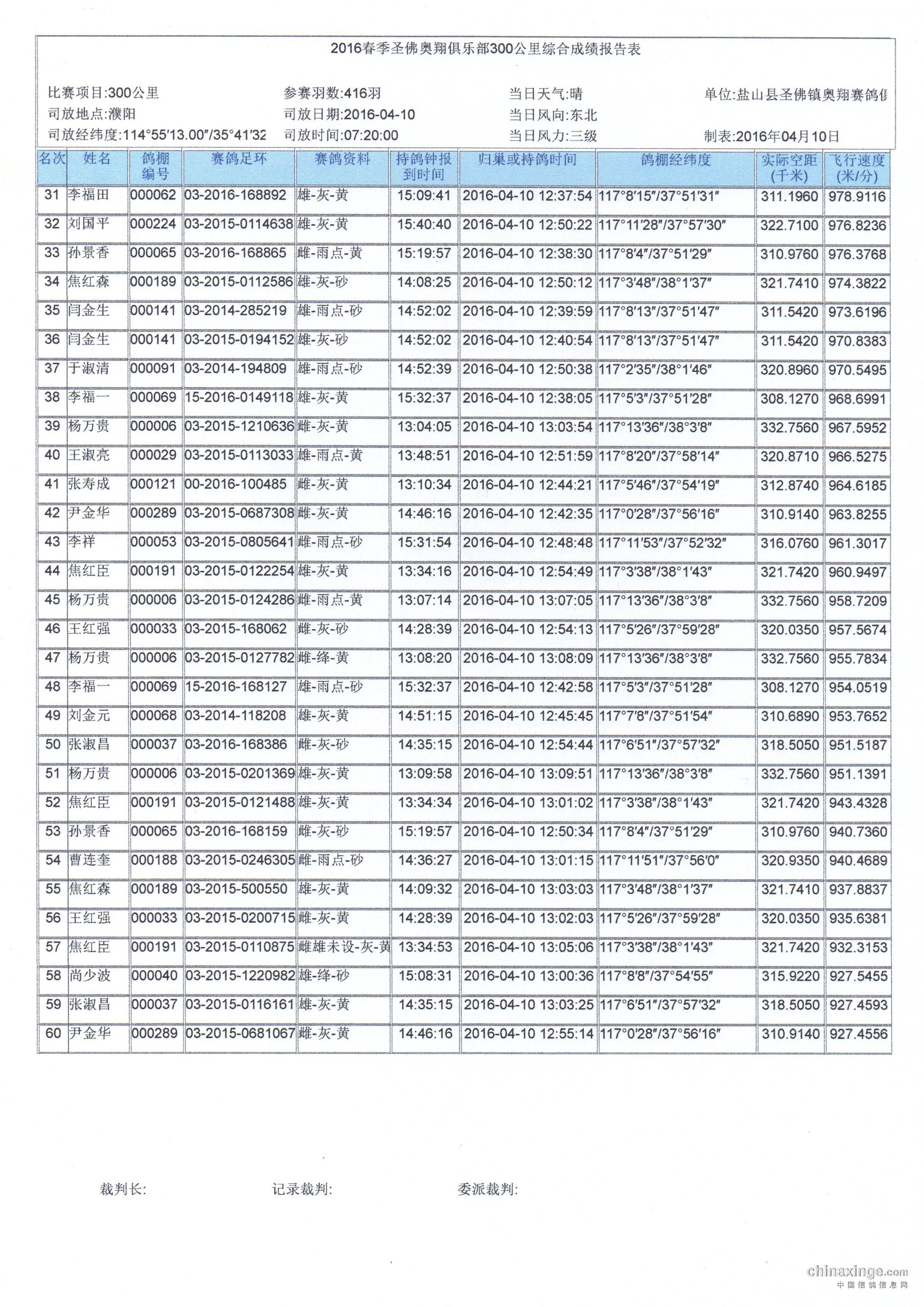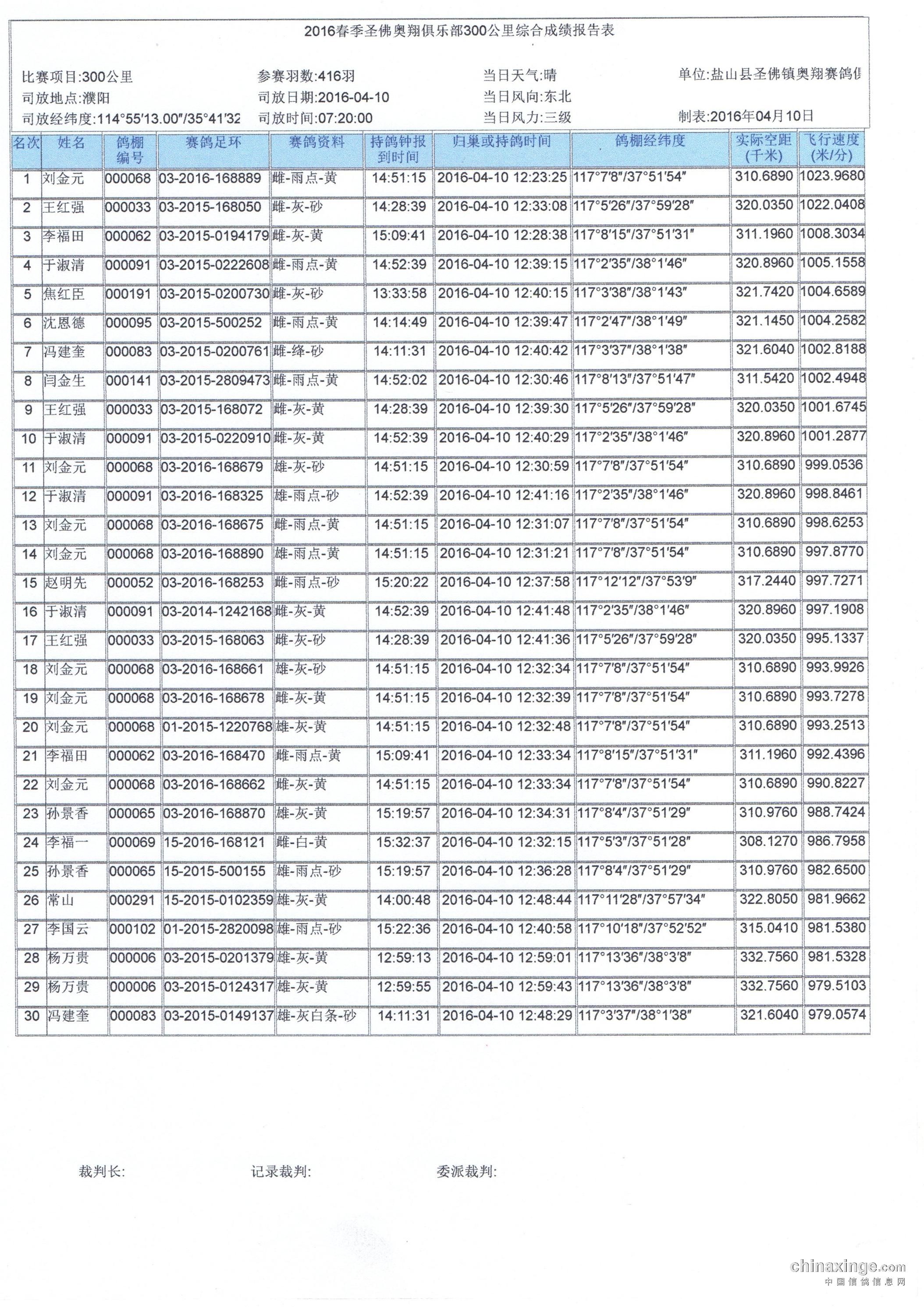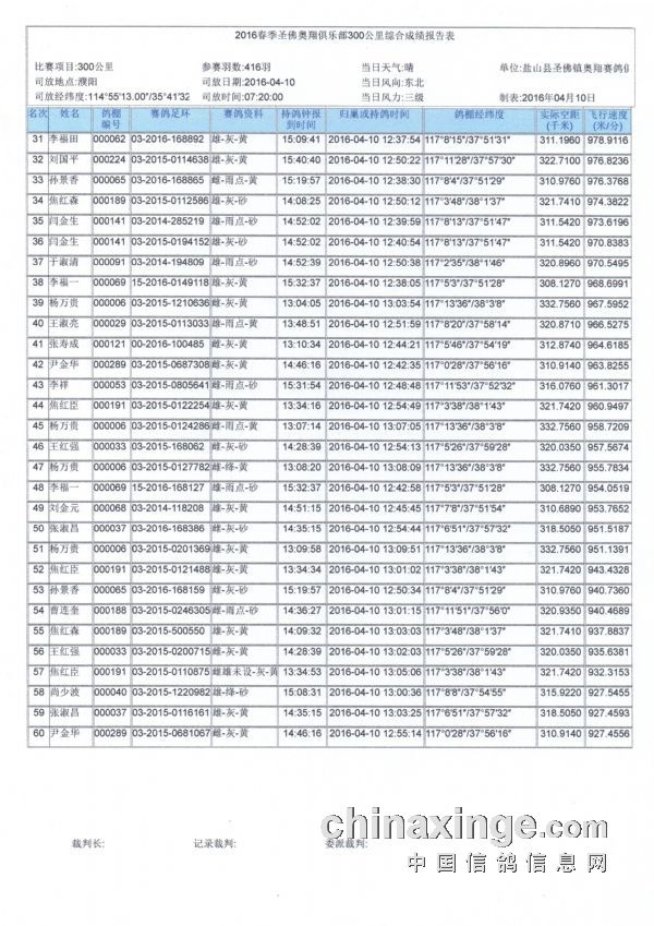 圣佛奥翔赛鸽中心2016春季300公里综合成绩