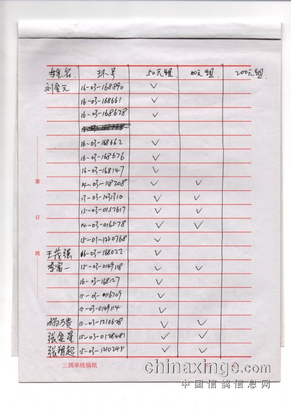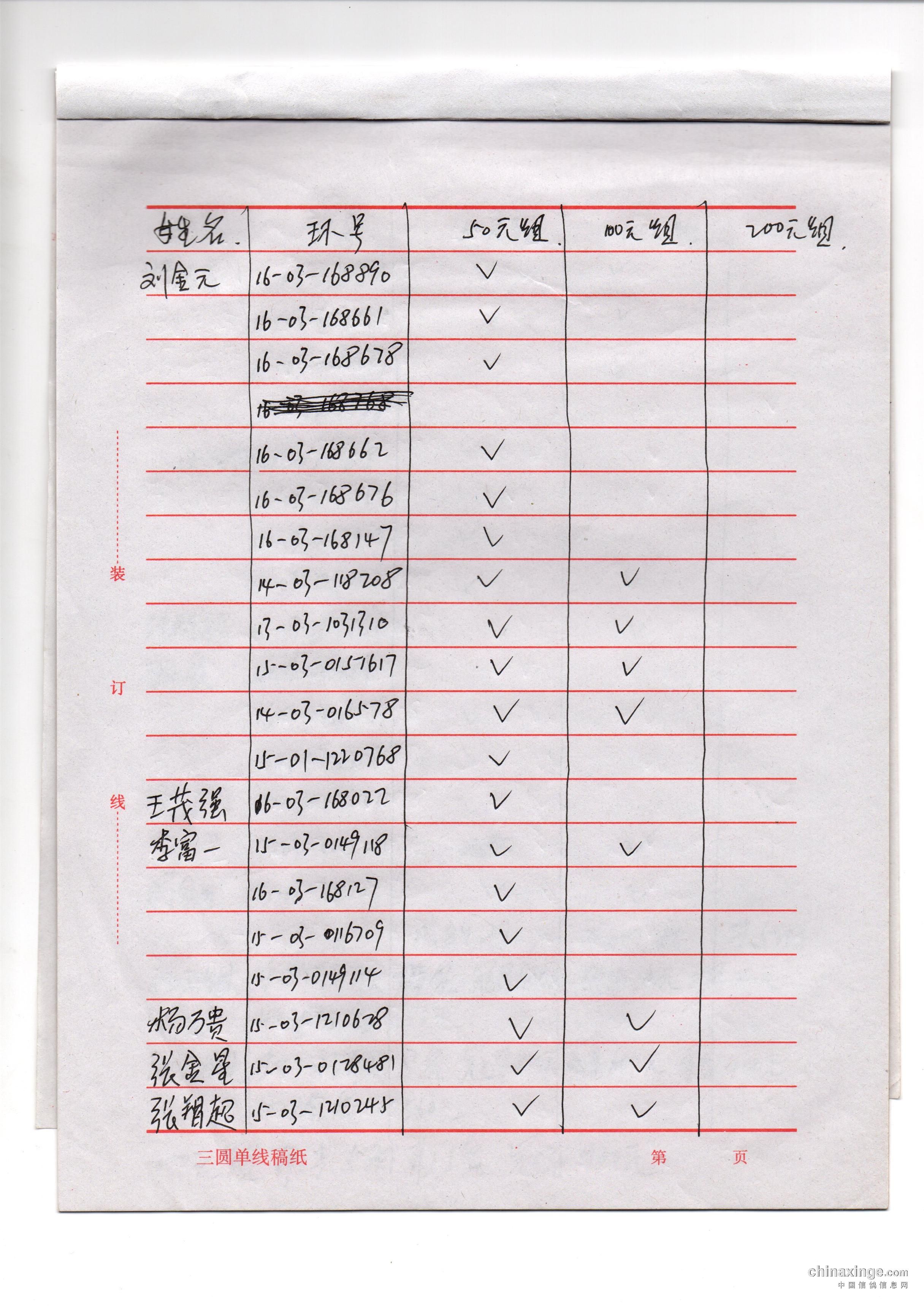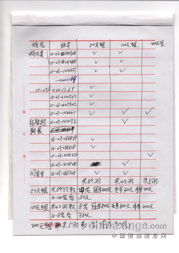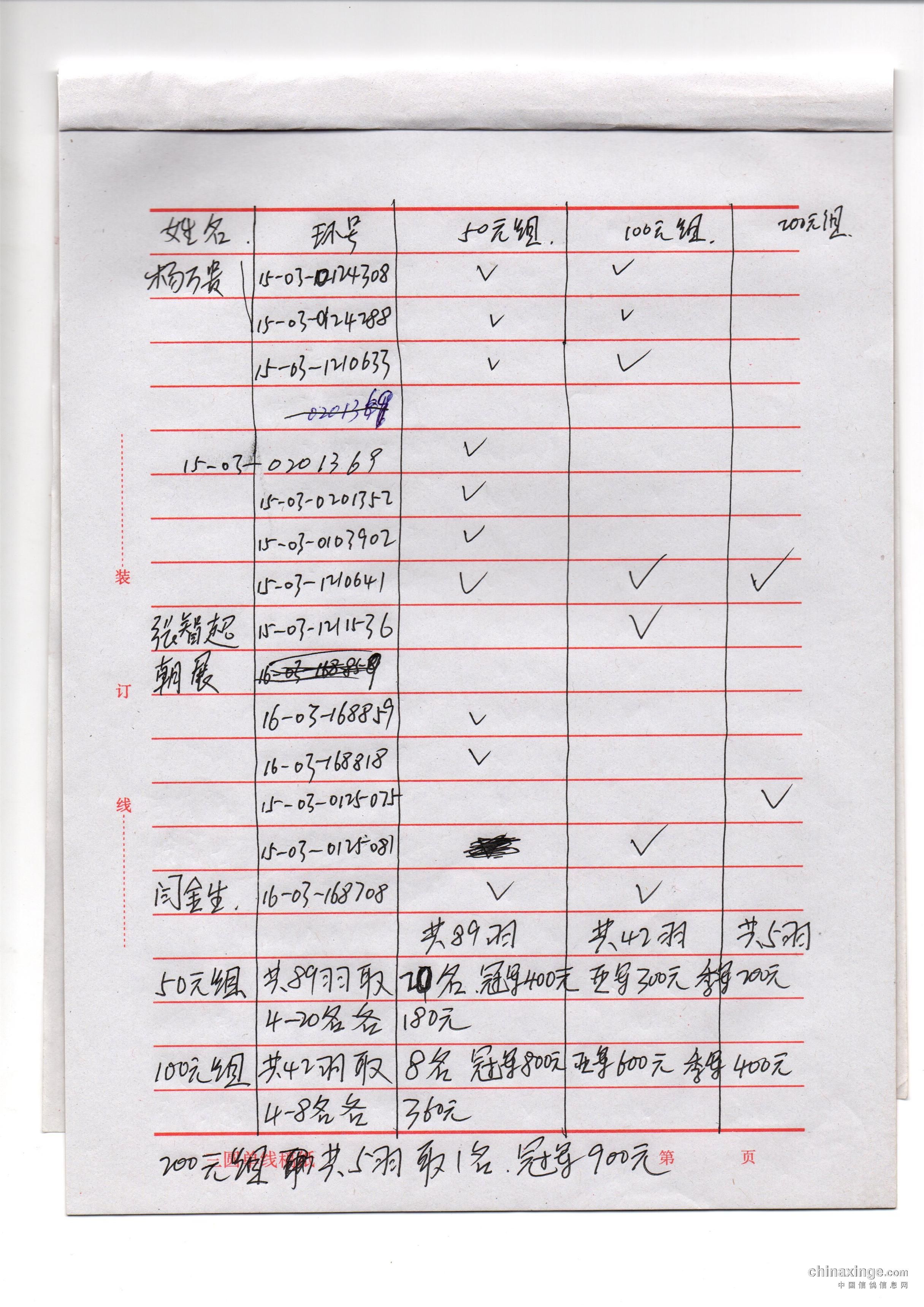 说明:50元组共89羽。取20名,冠军400元,亚军300元,季军200元,4-20各180元。