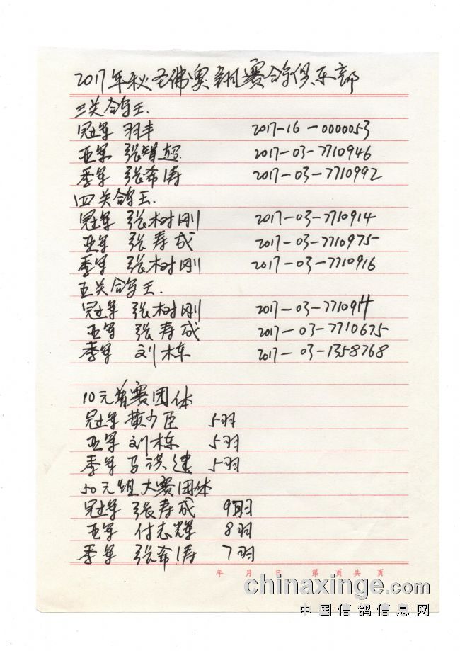2017秋季圣佛奥翔关赛鸽王、团体成绩