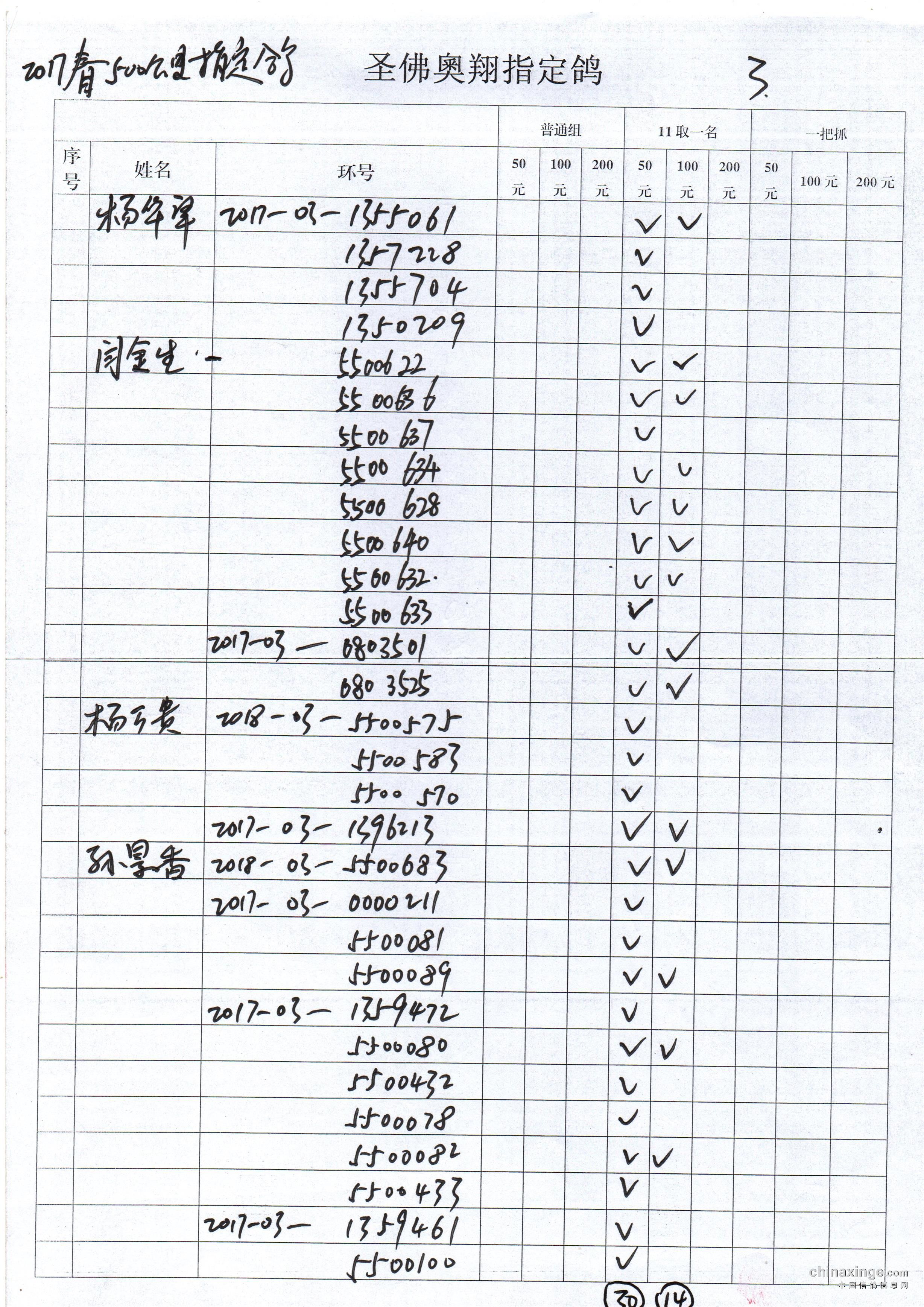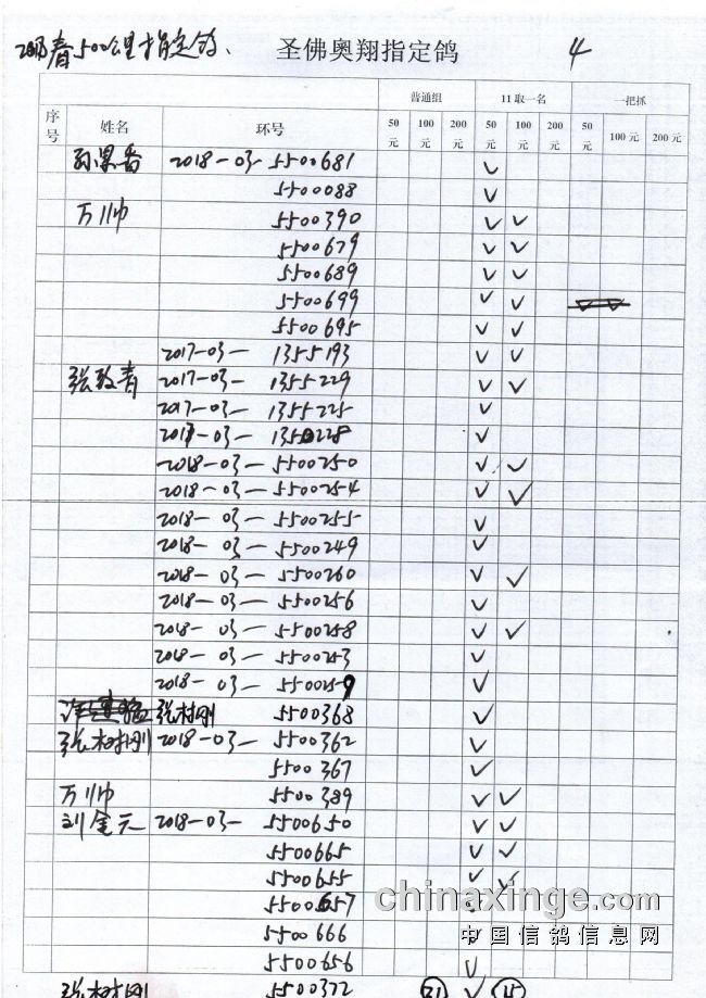2018圣佛奥翔赛鸽春季500公里指定鸽名单