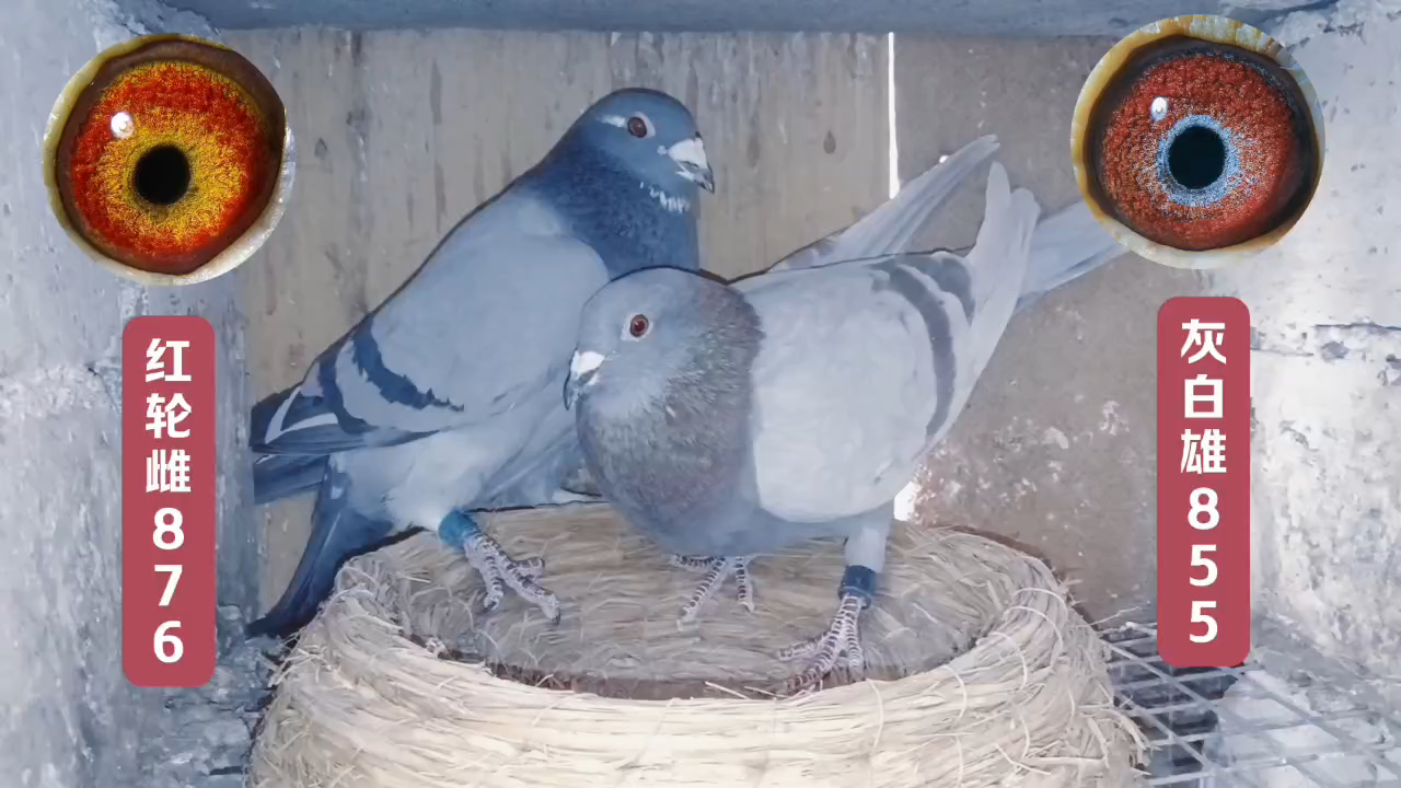 【2026年配对五】雄鸽2021年灰白条砂眼855,雌鸽2021年红轮黄眼876。两羽鸽子之前半当保姆半作育,25年留一窝蛋出两羽红轮也获奖。26年计划先让它俩出两窝再拆对,然后分别又去配别的鸽子出两窝。