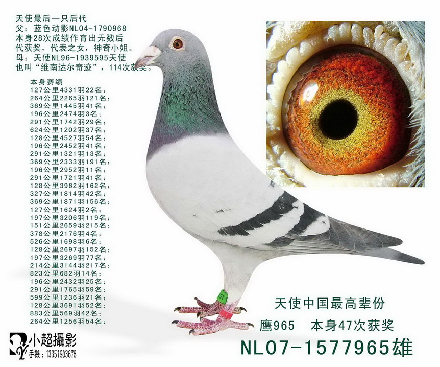 平辈同父的NL07-1578849 07年上海中荣第三关38名,第四个77名,第五关43名。 同父神奇小姐NL05-1137566本身波治国家赛9名,俱乐部冠军,梅尔冠军,香提利3名等。 同血 NL0979320第八届南北七关综合鸽王25名, NL07-1578451第九届百万欧元五关综合鸽王5名。 07年石家庄文星公棚决赛冠军 07慧翔国际公棚决赛7名 07飙友公棚预赛8名 08欧洲国际公棚预赛15名决赛亚军,鸽王冠军等等。