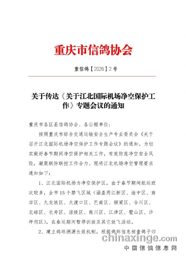 重庆市鸽协关于传达《江北国际机场净空保护工作》专题会议的通知