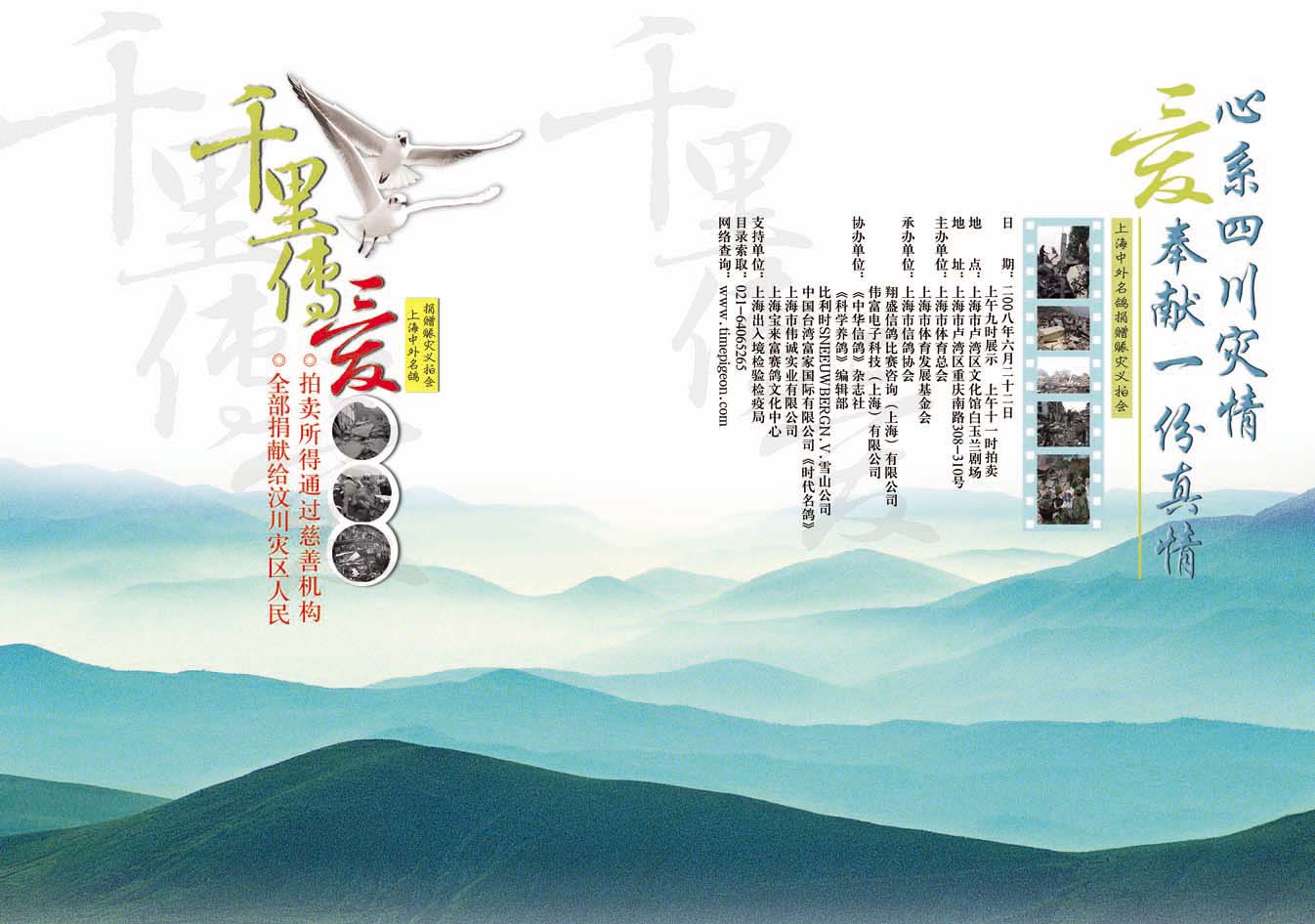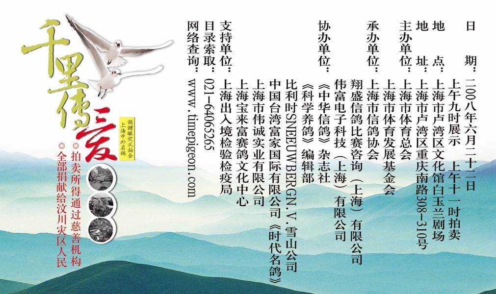为积极响应中央“一方有难,八方支援”的号召,我们信鸽爱好者也要以实际行动帮助灾区人民重建家园出一份力,汇报社会。为此,我们倡议:伸出你的手,献出你的爱;积极参加6月22日由上海市体育总会、上海市体育发展基金会主办,上海市信鸽协会、翔盛信鸽比赛咨询(上海)有限公司、伟富电子科技(上海)有限公司承办的“上海中外名鸽捐赠赈灾义拍会”,拍卖所得通过慈善机构全部捐献给汶川灾区人民。若你有意愿捐赠爱鸽义拍,请你于6月7日以前与上海市信鸽协会(63251215)或翔盛信鸽比赛咨询有限公司(64065265)联系报名,办理有关手续。