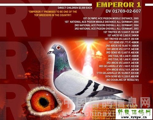“帝王一號"”與“環宇一號”同出一舍。這個鴿舍僅在2003年至2005年,就育出四羽奧林匹克鴿王及超過十羽國家鴿王。這不僅是德國最好的鴿系,也是世界最好的鴿系之一。“帝王一號”有着無與倫比的比賽成绩,並擁有完美無缺的身體結構。它的子孫已經被驗證是非常優秀的種鴿和賽鴿。