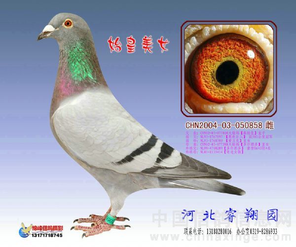 【血统】 父:CHN02-03-077800【年青秦始皇】铭粹轩作出 【秦始皇】直子,超级种鸽。 祖父:NL98-5821415世纪铭鸽【秦始皇】,凡赛尔世界锦标赛冠军。 直女:NL99- 5971371获698公里5831羽全国冠军 祖母:NL99-5971339【神奇女郎】,99奥尔良640公里全国冠军(超前亚军30分钟) 母:CHN02-03-077388【多尔那多女郎】 铭粹轩作出 【多尔那多】直女,超级种鸽。 外祖父:NL99-4708289【多尔那多】 豪登1643羽4名,奇梅4122羽9名。 兄:埃门凡先生获:2000年荷兰N90中距离鸽王冠军。 妹:埃门凡小姐获:529公里13137羽国家赛冠军。 外祖母:NL01-1135414【奇迹女孩】 【神奇女郎】同父母妹妹。 直女:NL99-5971371获698公里5831羽全国冠军. 【平辈成绩】 06年秋石家庄金石公棚1关11名,2关28名,3关43名。 06年秋河北宏源公棚决赛68名。 06年秋河北超速公棚决赛36名。 07年春河北东盛公棚决赛44名。 07年秋石家庄金石公棚决赛亚军。 07年秋500公里幼鸽特比环大奖赛亚军。 07年秋500公里万元大赛4名,5名。 08年秋河北科苑公棚预赛70名。 09年河北铭粹轩公棚预赛35名。 09年秋河北科苑公棚决赛38名。 09年以后,子代直接留种,不再直接参赛。 【平辈子代成绩】 05年秋天津聚龙公棚决赛6名。 05年秋黑龙江大庆500公里幼鸽特比环大奖赛6名。 06年秋山东高唐500公里亚军。 06年秋山东泰安500公里幼鸽特比环大奖赛冠军。 07年秋河北博友公棚决赛7名。 07年河北超速公棚决赛18名。 07年秋500公里幼鸽特比环大奖赛8名(与本舍亚军同时归)。 08年秋河北中达公棚决赛亚军。 08年秋河北中达公棚决赛19名,33名,75名,100名。 08年秋300公里7名,500公里7名双关综合亚军。 09年春博文公正杯百日龄300公里特比环大奖赛季军。 09年秋河北铭粹轩公棚预赛68名,决赛123名。(同羽鸽) 09年秋河北铭粹轩公棚决赛79名,226名。 09年秋河北惠友公棚一关35名,二关31名,三关202名。 09年河北科苑公棚预赛86名,决赛176名(同羽鸽) 09年河北科苑公棚决赛43名。 09年河北中达公棚决赛270名。 09年内蒙祥盛公棚加强赛18名。 2010年春季公棚赛; 河北正信公棚决赛第4名,【当日归14羽】。 河北鼎盛园公棚决赛89名【当日归124羽】。 河北友众公棚决赛113名【当日归177羽】。