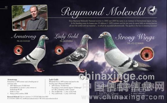 他是荷兰很有名的长距离赛冠军,而他不满足仅仅是长距离冠军。所以他又用优中选胜的赛鸽方法,作出了短距离赛和中距离赛的冠军。他在2004年,购买了40羽冠军鸽,其中许多是NPO赛得冠军。他用自己独特的方法培养出那些速度赛鸽。他不是别人,正是雷蒙德-穆尔菲德。对雷蒙德来说,不够好的鸽子是不值得他付出时间和精力来培养的。在经过多年的经验可鉴,他的速度赛鸽基本的家系也被确定下来了。那就是库曼鸽和凡戴克鸽、克拉克家系鸽,Gerritsen-van Looyengoed鸽。
