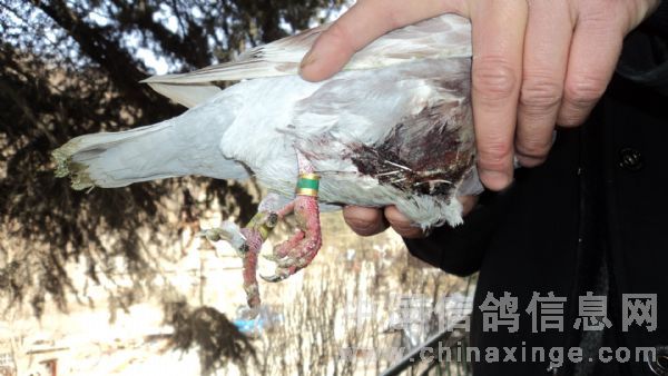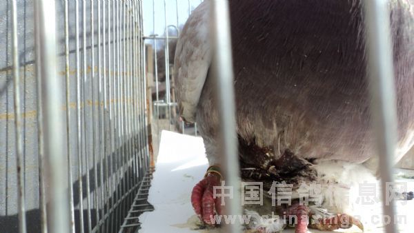 周日又去黑山沟矿区训放10公里,经过一商店门口树上挂着一个鸟笼引起我的注意,停车定眼一看,里边确实卧着一羽红色的鸽子,仔细观察是一羽胸部受重伤且腿骨折的伤鸽,和商店老板了解:是三天前矿工在山坡上捡到的,当时流着血太可怜了,大家都知道自己爱养话眉鸟,对鸟类生活习性略有所知的缘故,为此就送到商店了,只好装在空鸟笼里,又喂食又上消炎药,现已好转。通过对足环确认,是上周另一鸽友训放丢失的红狐小选手,商店老板为找到主人而高兴,马上归还了伤鸽。 1.