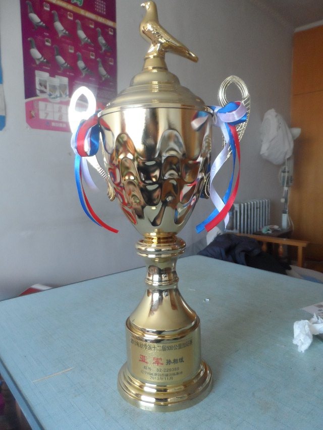 本人05年建棚养信鸽,刚开始也不会养,入市会成绩也不太好。在08年从北京爱亚卡普拍回一羽215名雨雌,【国家-号直孙x苍白骑士直孙女】当年同时又引进一羽【国家-号直孙;大灰狼直子;06-06-139182】【鞍山中山家具做育】后09年市会秋赛有了不错的成绩;以往公棚都不敢想 。在2011也送几羽试试,【锦州翔瑞公棚】结果飞出了300公里11名;500公里18名;两关鸽王第5名的成绩;2012年又送几羽;获266名;‘都是它们的……