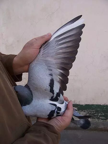 理想的尾羽应长于大羽轴2-2.5厘米。尾羽的羽茎必须是强壮的,以利突然起飞。优良赛鸽的12根尾羽就像一把折扇,散开时形如半月,合起来要成一扇柄,俗称:“一字尾”。