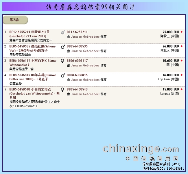 每一分钟的流逝、每一次加价的数目都让人心惊肉跳,下标者生怕下一秒爱鸽便属于他人。随着结拍时间的临近,本次拍卖的价格浮出水面,平均价格21390欧元/羽,创下了赛鸽界均价全球新纪录!全场拍卖总数折合人名币约350万元。这次拍卖的鸽子是詹森兄弟最后的作品也是孤品,以后任你再有钱也不会再从詹森兄弟那得到一羽鸽子,从此传奇落幕,在以后传奇詹森名鸽档案里将会收录这26羽名鸽,并会一一为鸽友们介绍也便于咨料的查阅,这次给鸽友们介绍的这羽鸽子是这26羽之中名叫年轻白羽号的鸽子。