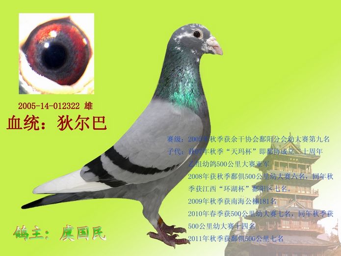 本鸽舍建于2005年,2006年入会参赛,鸽舍以狄尔巴、詹森、杨龚多拉斯、凡布利安娜、西翁、凡龙、桑杰士等铭血鸽系,经过历年来的实战,培养出一批集种赛为一体、全天候、全距离(300公里、500公里、700公里)都能夺冠的特战队。湖城2014春季300公里成幼混合赛,四名。700公里八名九名。 湖城2014秋季500公里幼鸽大赛,九名十名。 湖城特比九名。湖城……
