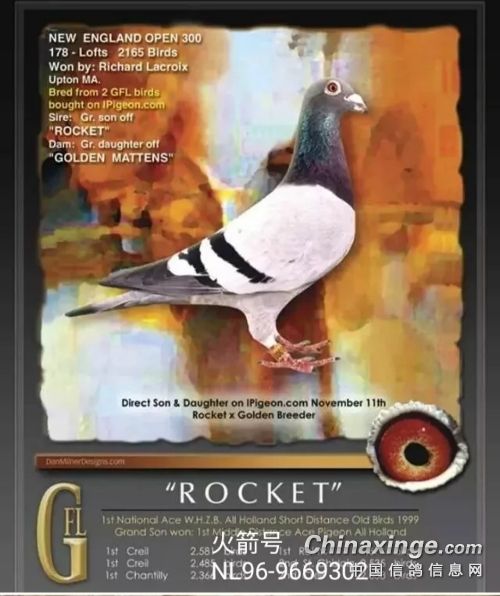它的子代获得国家赛冠军和多个国家赛前20名,它的孙代获得05年荷兰WHZB中距离国家鸽王冠军和多个万羽以上大赛前20名。
