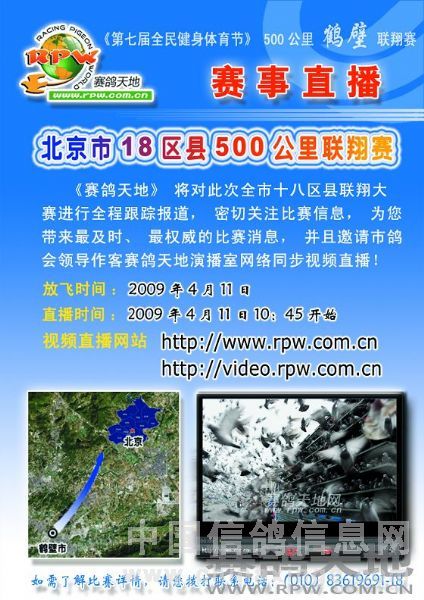 由北京市信鸽协会主办,全市十八区县信鸽协会承办的2009年《第七届全民健身体育节》500公里联翔赛将于4月11日在河南鹤壁市开笼!现在市内各个区县协会正在紧锣密鼓的筹备赛前工作,比赛集鸽工作定于明天下午(4月10日)进行。 2007年4月15日,《第六届全民健身体育节》500公里联翔赛正式开赛,数万羽参赛鸽腾空而起,冠军分速达到1179.6米。相信在今年举办的《第七届全民健身体育节》500公里联翔赛中,参赛鸽友们会取得更优秀的成绩! 《赛鸽天地》全体工作人员整装待发,对此次《第七届全民健身体育节》全市十八区县500公里联翔大赛进行全程跟踪报道——我们将对比赛集鸽、开笼放飞、赛鸽归巢等全部环节给鸽友们提供最及时、最全面、最权威的比赛报道!并且实现网络同步视频直播——http://video.rpw.com.cn/。