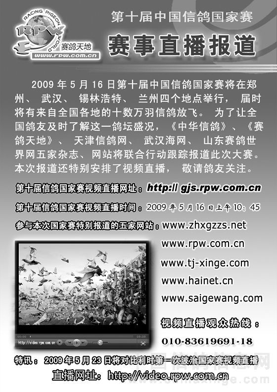 2009年第十届信鸽国家赛将于本周隆重开幕,5月16日,来自全国各地的赛鸽将在郑州、武汉、兰州和锡林浩特四个赛区同时开笼。其中上届因“5.12地震”临时取消比赛的兰州赛区将重装上阵,而内蒙的锡林浩特市也将取代天津市成为本届国家赛的四个赛区之一。 1999年10月9日,第一届国家赛在河南南阳开笼放飞。而那一年恰逢祖国的五十华诞。今年在祖国即将迎来六十岁华诞之际,国家赛也迎来了其10岁的生日。十年的时间让中国信鸽国家赛发生了很大的变化。赛区由最初的一个地方扩展到现在的四个地方;比赛的级别也由原先的800公里一个级别扩展到现在的300公里、400公里、500公里、600公里、700公里、800公里、900公里、1000公里及以上级等八个级别。可以说从赛点设置、竞赛规程、比赛规模以及实际效果等方面都有了长足的进步。 此次第十届信鸽国家,赛鸽天地将携手《中华信鸽》、天津信鸽网、武汉海网和山东赛鸽世界网,对整个比赛的盛况进行全角度、多方位的报道。届时您可以通过以上网站收看到整个比赛的精彩视频和最新的图文报道;在随后的《赛鸽天地》、《中华信鸽》等杂志以及《赛鸽天地》电视栏目里,您还将欣赏到关于此次大赛更加全面、深入的报道。敬请广大鸽友关注此次报道。 最后,赛鸽天地预祝本次国家赛取得圆满成功!