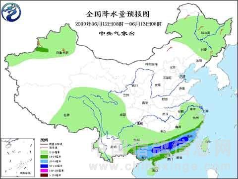 中央气象台2009年6月12日06时发布未来三天天气趋势预报称,江南南部华南等地有较强降雨,新疆北部东北地区多阵性降水。