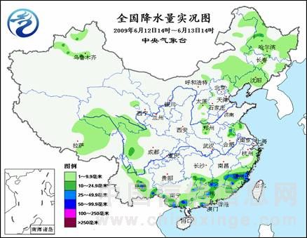图1 全国降水量实况图(6月12日14时~13日14时)