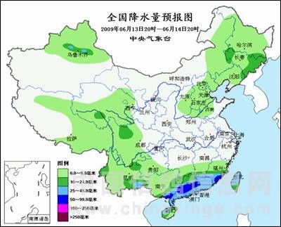 图2 全国降水量预报图(6月13日20时~14日20时)