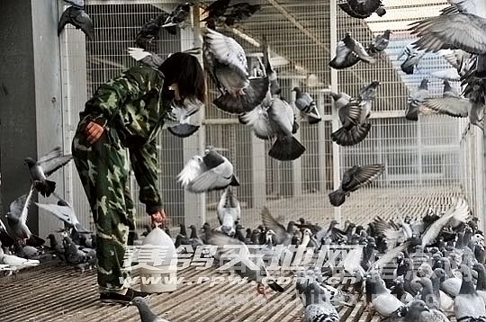 图:清一色女孩来呵护4000多羽参赛鸽 图:公棚隔离室,每天收到的参赛鸽现在这里隔离观察 图:工作人员管理鸽棚 图:给鸽子喂食
