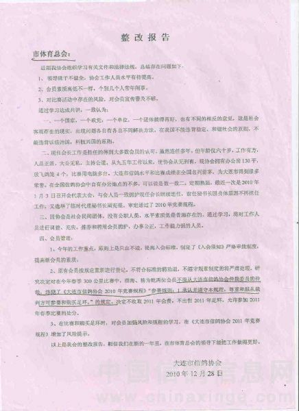 (待续) 不伦不类的“处分”(待上传) 作者声明: 本文未经作者同意严禁转载 附:处分决定 整改报告 (《信鸽中国网》编辑 吴玲玲按《处分决定》、《整改报告》打印、并校对) 大连市信鸽协会关于对薛海、杨为乾 两位会员的处分决定 在今年春季300公里比赛中,上述两位会员不服从大连市信鸽协会仲裁委员会的仲裁,违犯了《大连市信鸽协会2010年竞赛规程》“参赛规则:1、承认并遵守本规程,尊重和服从裁判方可参赛和购买足环。”的规定。 经研究决定处分如下: 一、不收取2011年会费 二、不出售2011年足环 三、允许参加2011年春季比赛。 特此决定 大连市信鸽协会 2010年12月20日 抄报:大连市体育总会,大连市民政局。 整改报告 市体育总会: 近期我协会组织学习有关文件和法律法规,总结存在问题如下 1、领导班子不健全,协会工作人员水平有待提高。 2、会员素质高低不一样,个别及个人常年闹事。 3、对比赛活动中存在的风险,对会员宣传普及不够。 通过学习达成共识,一致认为: 一、一个国家,一个政党,一个单位,一个团体搞得再好,也有不同的相反的意见,这是社会客观存在的现实,出现问题各自有各自不同解决方法,在我国不能违背稳定、和谐社会的原则,不能违背以(按:应为“依”)法治国,科技兴国的原则。 二、现任会长工作是胜任的得到大多数会员的认可,虽然连任多年,但年龄仅六十岁,工作有方,人品正派,大公无私,主持公道。从九五年工作以来,使协会从无到有,到协会拥有办公房130平,放飞鸽笼4个,比赛用电脑多台,大连市信鸽水平和比赛成绩在全国名列前茅,为大连市得到很多荣誉。在全国信鸽协会中自有办公地点的不多,可以说是数一数二。定期换届,最近一次是2010年1月3日召开会代表大会,与会人员一致拥护现任会长继续连任,前任秘书长因身体原因不再担任工作,又选举了临时代理秘书长周宪银。审定通过了2010年竞赛规程。 三、因协会是社会民间团体,没有公职人员,水平素质低是普遍存在的。通过学习,将对工作人员进行调整、充实。推荐和聘用会员拥护,办事公正,工作能力强的人员。 四、会员管理: 今年的工作重点,原则上是只出不进,提高入会标准,制定了《入会须知》严格审批制度,提高新会员的素质。 原有会员按规定重新进行登记,不符合标准的将劝退,不遵守规章制度的将严肃处理。研究决定对在今年春季300公里比赛中,薛海、杨为乾两位会员不服从大连市信鸽协会仲裁委员的仲裁,违犯了《大连市信鸽协会2010年竞赛规程》“参赛规则:1、承认并遵守本规程,尊重和服从裁判方可参赛和购买足环。”的规定。决定不收取2011年会费,不出售2011年足环,允许参加2011年春季比赛的处分。 在比赛和购买足环时,对会员加强风险和规程的学习,在《大连市信鸽协会2011年竞赛规程》增加了风险提示。 以上是我会的整改报告,相信我们在新的一年里,在市体育总会的领导下能把工作做得更好。 大连市信鸽协会 2010年12月28日
