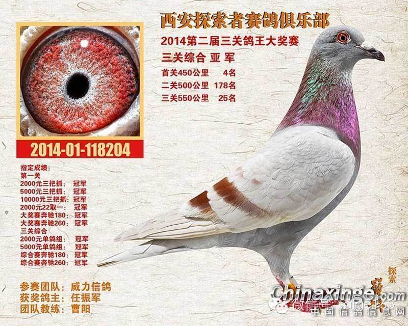 17、威力团体会员任振军的14-01-118204红轮鸽获得三关综合亚军。同时,此鸽在第一关、第三关比赛中,获得总计10项指定赛冠军,吸金不菲!