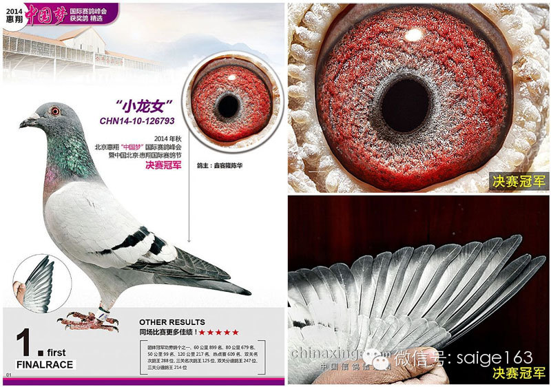 8、2014惠翔“中国梦”国际赛鸽峰会小棚决赛于12月13日上午07时34分在河南鹤壁浚县开笼放飞,天气晴,无风。鑫客隆陈华的10-126793灰鸽夺取冠军,分速为1227.5864米/分。
