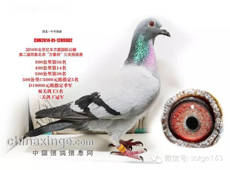 11、牛牛鸽舍的14-01-1289902灰鸽以4048.246483米/分的累计分速获得北京亿丰万豪公棚三关综合冠军。