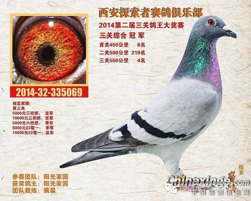 16、2014年西安探索者赛鸽俱乐部550公里决赛11月1日在内蒙伊金霍洛旗放飞,经过前两关淘汰之后,共计上笼548羽参赛鸽。阳光家园的14-32-335069灰鸽获得首关6名、次关219名、决赛4名,以3383.9775米/分的综合分速夺取三关总冠军。