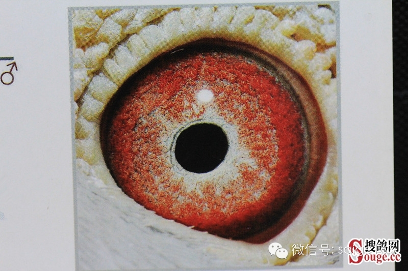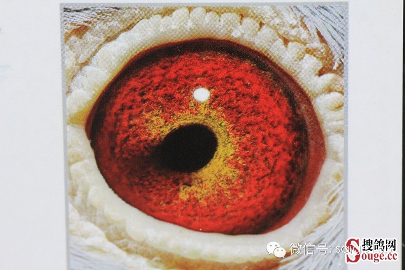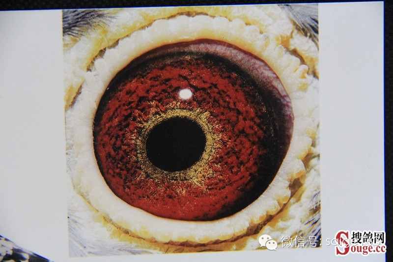 鸽眼的各个部分,是由鸽友按照特性命名的。从内到外分别是瞳孔-眼志-底砂。眼志与底砂之间=眼志圈。有的是一个色素有的不是。眼志与瞳孔之间是内线扣,需用放大镜才能看清。底砂分为三大类,底砂黄色为黄眼,白色为砂眼,有层次的黑色为牛眼。有牛眼血统在内的鸽子才会出现血影。眼前下角的瞳孔与底砂之间的部分有阿尔赛。