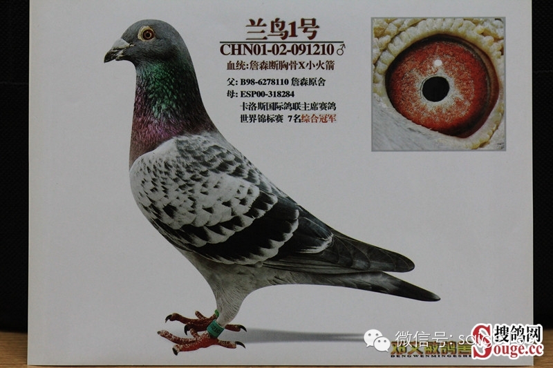第一羽鸽子是名为兰鸟一号。兰鸟一号之父是98年从詹森家亲自引进。兰鸟一号之母是国际鸽联主席卡洛斯飞的7名/综合冠军,血统为邦德007,因此兰鸟一号实际上是一只纯詹森血统的鸽子。
