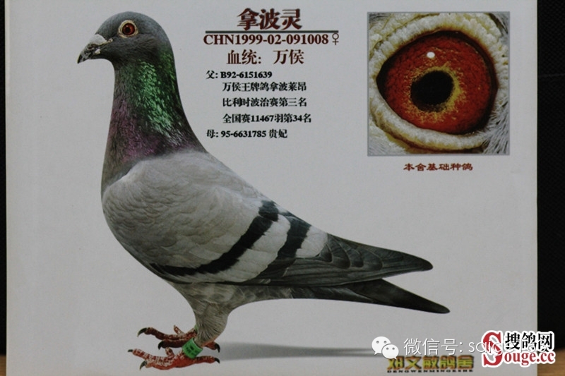 第三羽鸽子命名为拿破灵,为98年引进的万侯品系。万侯家当时有5羽王牌,两雌三雄,这是其中一羽雌鸽。邓老师以一万五千美元买下。它本身曾获波治第三名。