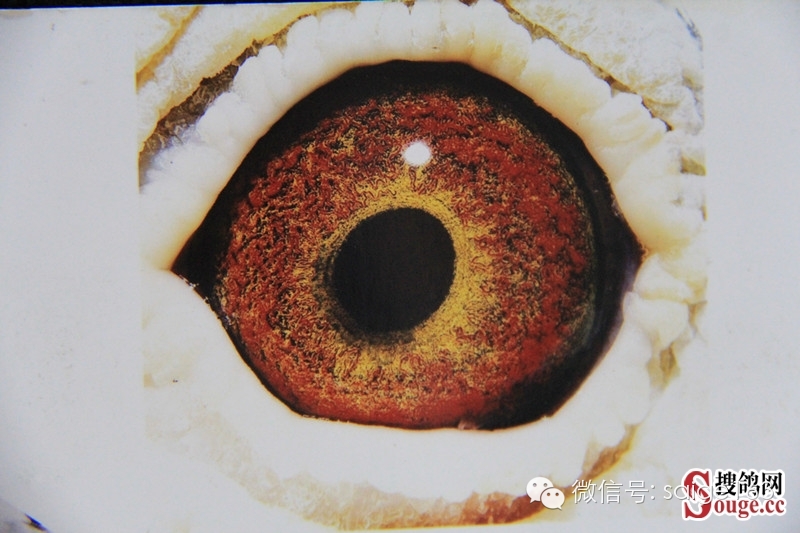 这羽鸽子的眼睛,底砂、面砂,纵向分布特别均匀,呈放射线状。横向分布也特别均匀,表现在底砂与面砂之间呈环状间隙。