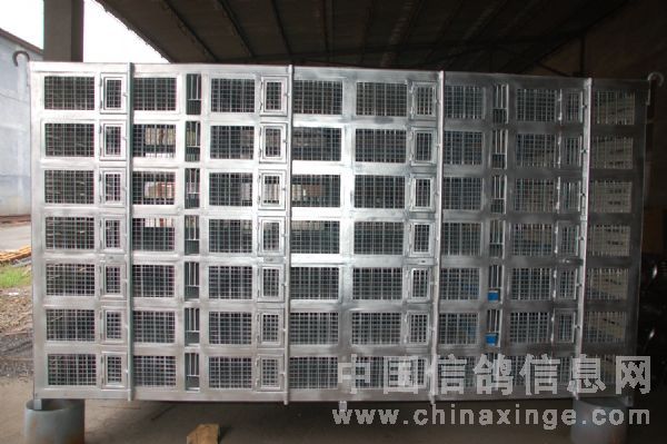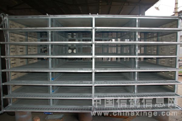 此鸽笼共分7层,每层有2个饮水槽(1毫米钢板热镀锌)、4个笼体组成,每个笼体标准容纳赛鸽80羽,总体可容纳2000-2200羽。
