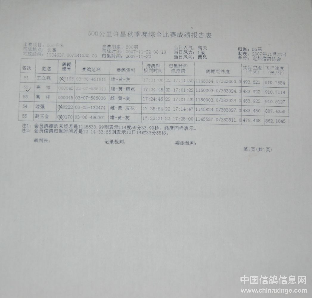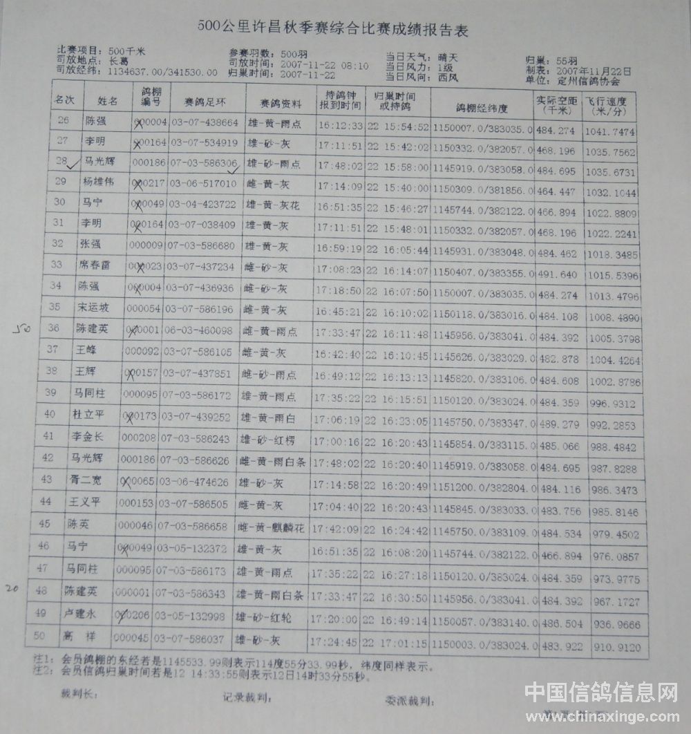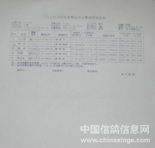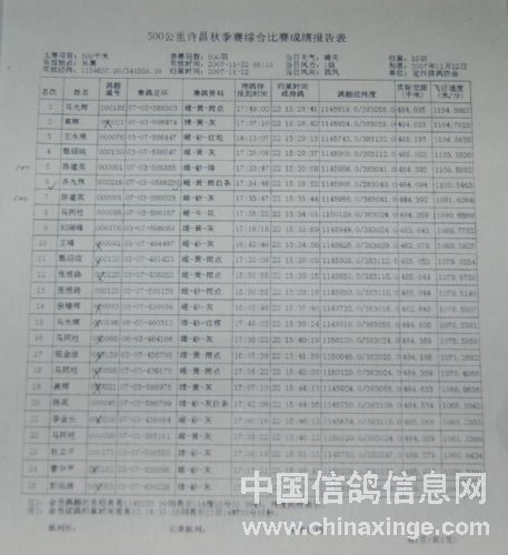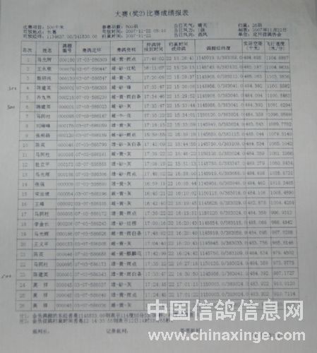 | 定州市2007年秋季三关鸽王赛成绩表 |