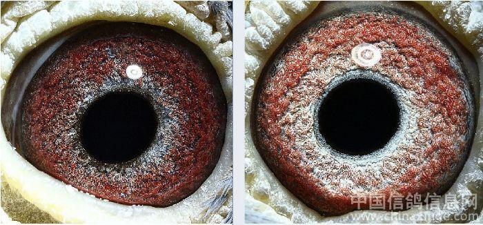9. 它是一只外线口是全线口,颜色是前黑后白,底砂白透底呈黑色,面砂不规则且红,底砂和面砂透气性极好,外封砂较宽呈灰黑,荡前角脚砂起毛不规则,瞳孔椭圆前倾,标准的雾天快速鸽的特点。能较好地作种。