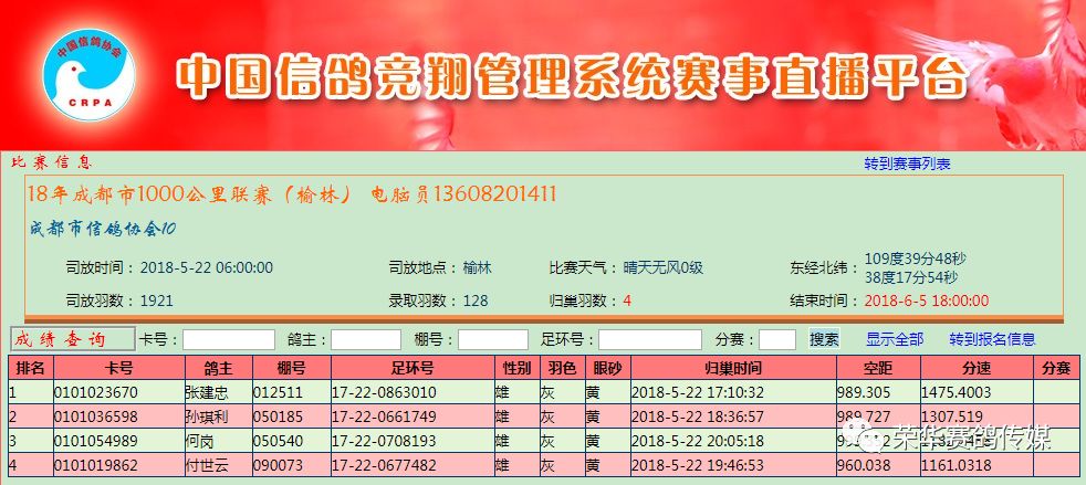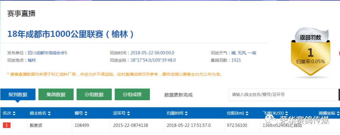 截止当日晚上20:05:18前数据统计,又惊现4羽战将载誉而归,当日共计归巢5羽,且各羽分速惊人,再次刷新四川鸽坛历史记录。他们分别是: