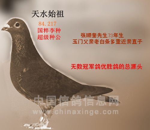 其父为张顺奎先生纯李种73年生玉门父亲老白条。此鸽在上海市作出不少远距离、超远距离冠军鸽及优胜鸽,不愧为国血精华,一代良种。