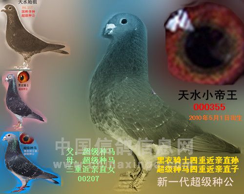天水小帝王出生于2010年5月1日劳动节,或许出生日选择了它爱操劳的天性。2011年2月,年仅9个月的天水小帝王对送进巢箱的济南一姐023947一见钟情,速配成功,作出五重近亲子代(取4分之3比例)11.125220深雨斑雄,获铁路鸽会500千米20名,幼鸽6名。