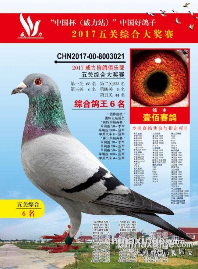2017闪亮西安威力赛场的壹佰赛鸽【白爪爪】,斩获威力庄园5关职业赛的最高奖金,而在威力庄园第一关比赛中,就遭遇了“黑色比赛日”6000多羽赛鸽有效归返只有600多只,而这只白爪爪在经历了第一关生死关后,越战越勇,最终斩获5关综合6位,斩获几乎所有指定、暗插奖项!