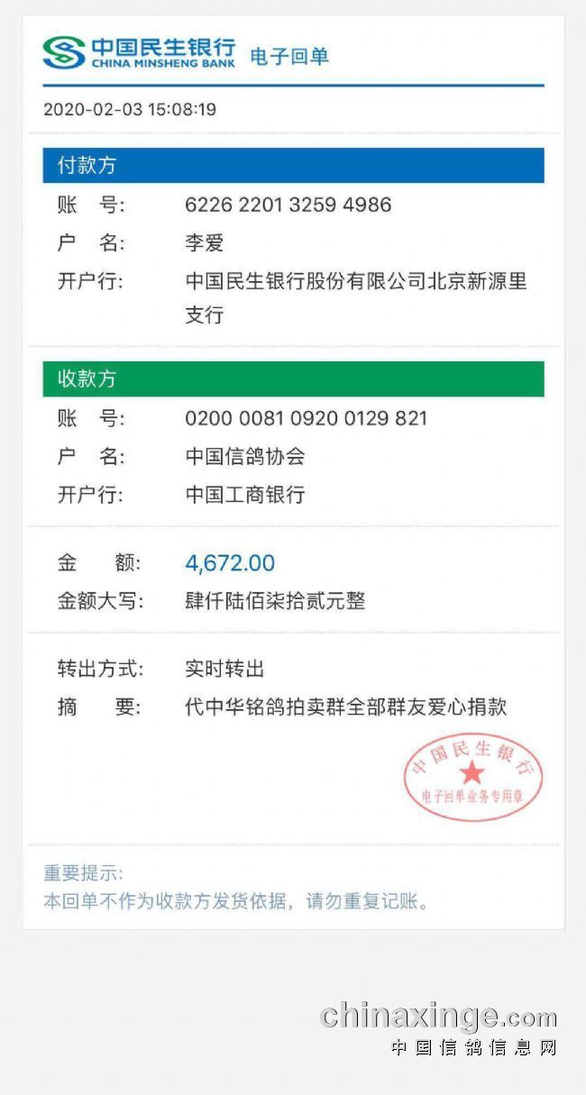 本次爱心募捐款一共4672元,已请负责中鸽协官网的李爱代捐。