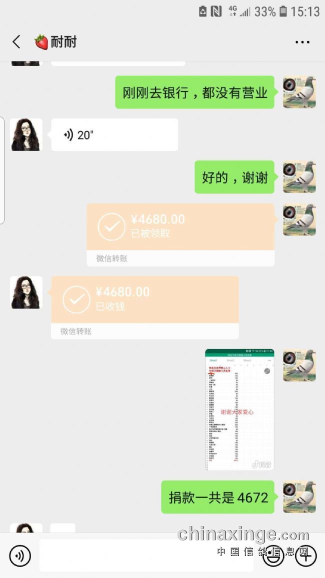 新型冠状病毒肺炎疫情发生以来,我时时刻刻都在关注疫情的情况,怀着沉重的心情,考虑了两天,能够以什么样的方式为武汉尽一点绵薄之力,于是我在中华铭鸽拍卖群发起募捐活动,鸽友们很支持这次募捐活动,一位经营鸽粮,不是鸽友的爱心人士通过我发朋友圈看到募捐信息,也毫不犹豫的献出爱心。