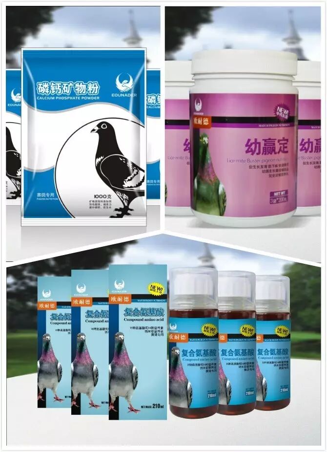 幼鸽出壳后第50~60天开始第二次换羽,最先更换的是主翼羽,每隔15~20天两侧成对地同时脱换一根主翼羽。此时幼鸽生长发育最快,代谢旺盛,对营养物质的数量和质量要求较高,需要较充足且优质的营养素,比如更多的能量、蛋白质、钙磷、维生素、铁等,这个阶段可以给幼鸽使用欧耐德的幼赢定,每天2粒,复合氨基酸每周使用2-3天,磷钙矿物粉拌料每天使用,一次补充赛鸽换羽所需钙、磷、铁、锌等矿物质,及时补充羽毛快速生长时必须营养及充足的蛋白质,以满足羽毛生长的需要。