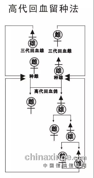 以上这幅图是一个简单的三代回血图样,这样回交出来的后代,既能做种又能比赛,是绝对的“远亲近配”模式。但这样的后代与种鸽的纯度依然还是不够理想,毕竟后代的血液里还流着其它杂血。那么我们见下图: