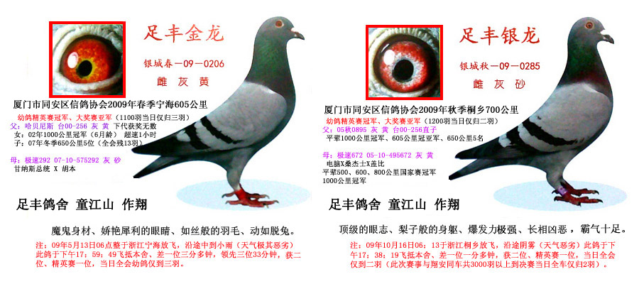 09年春同安区浙江宁海决赛605公里 精英赛冠军 幼鸽赛亚军(恶劣天气 当日仅归3羽) 精英赛6名。有效名次录取35羽 本舍占4羽 全会最高奖 09年秋同安区浙江桐乡700公里幼鸽精英赛冠军 幼鸽大奖赛亚军、38名。(赛事极其艰难 全会当日仅归2羽) 全会最高奖