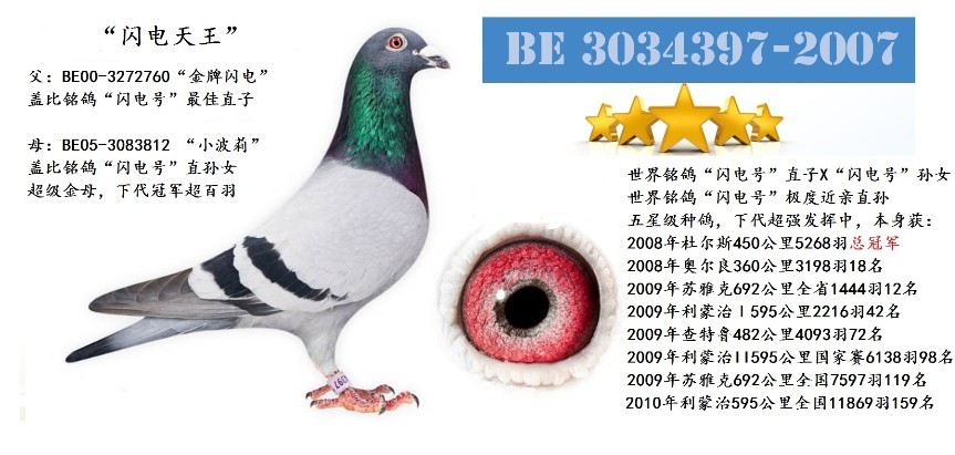 本人酷爱养鸽,主要品系凡龙超级73,詹森,(毕加诺)盖比,美国盖诺斯(甘纳斯),大名鸽令狐冲直子,东方不败直子,我的宗旨:以鸽会友,互通有无,真诚以待,共同发展.真诚感谢北京吴春山老先生,京维公棚尹小维先生,王普刚先生大力支援种鸽!(我们认为鸽子在飞不在吹,所以不登载以往成绩)我们真诚的期待全国各地的鸽友与我们联系互相交流,互通有无!!!!!!!!!! 2010年包头仁昱公棚决赛鸽王亚军 2010年包头翔宇公棚决赛20名 2010年宁夏贺兰公棚加站赛20名65名 2009年包头银海公棚决赛16名 2008年 广东潮洲爱亚卡普决赛20名(杨国栋使翔) 2008年北京惠翔公棚预赛121名 2008年北京爱亚卡普恒通公棚预赛51名 2008年内蒙古包头爱亚卡普复赛61名 2008年内蒙古鄂尔多斯公棚第一关52名 2008年山西信友公棚预赛44名决赛36名鸽王十位 2008年5月10日(春)宁夏贺兰赛鸽公棚获13名156名257名310名 2007年山西信友公棚预赛34名决赛5名鸽王2位大小指定亚军(拍卖价20000元) 2007年金方舟赛鸽公棚270公里热身赛20名200元指定冠军 2007年金方舟赛鸽公棚350公里预赛综合指定冠军 2007年翔盛赛鸽公棚270公里热身赛(第一关)指定冠军 2007年天宇通赛鸽公棚350公里预赛31名 2007年天宇通赛鸽公棚502公里决赛89名 2007年天宇通赛鸽公棚350公里200元预赛指定冠军 2007年春火车头350公里2498羽21名77名 2007年春火车头420公里1207羽21名24名 2007年春火车头500公里1093羽61名68名 2007年秋火车头350公里1924羽44名 2007年秋火车头420公里1755羽13名23名77名(指定5名) 2007年秋火车头500公里1648羽27名(当日仅归68羽)(指定7名) 2007年内蒙古金方舟公棚赛以综合成绩获得鸽王7位(270公里20名)(350公里220名)(500公里154名上笼4309羽当日仅归280羽以鸽王最高价15000元拍出)