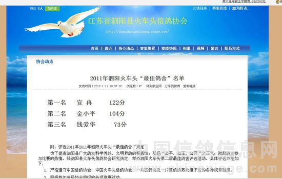 1月12日,从江苏泗阳火车头信鸽协会网站获悉,本舍荣获2011年度“最佳鸽舍”荣誉。 本舍2011年度成绩如下: 1、泗阳火车头鸽协300公里商丘竞翔季军、9名、10名、11名、20名、26名、27名,团体冠军; 2、泗阳县火车头鸽协400公里开封竞翔亚军、17名、33名, 团体季军; 3、国家赛500公里郑州(泗阳赛区火车头鸽协)竞翔4名、18名、29名; 4、泗阳火车头鸽协300公里曲阜站综合4名、21名、24名、44名; 5、泗阳火车头鸽协300公里曲阜幼鸽精英赛亚军、7名、20名, 团体季军; 6、泗阳县火车头鸽协“中瑞杯”500公里比赛亚军、季军、4名、11名、19名、27名; 7、泗阳火车头鸽协500公里35元特比环亚军、6名、9名、23名、48名,团体亚军。 (详见江苏泗阳火车头信鸽协会网站)
