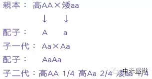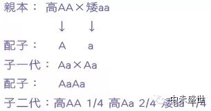 关于显性原理可以引用门德尔著名的豌豆实验来说明。在豌豆中不仅有许多品种,而且各品种之间还有众多不同的性状。如某一品种的豌豆是圆形的,另一品种是皱皮的;有些又是高茎的,另一些则又是低茎的。圆形和皱皮构成一对性状,高茎和矮茎构成另一对性状。门德尔在杂交实验中发现,经过杂交子一代的每个性状总是和某个亲本相似,如高茎×矮茎→高茎,圆种子×皱皮种子→圆种子。门德尔把在子一代中表现出来的性状称为显性,末表现出来的性状称为隐性,即高茎对矮茎是显性,矮茎对高茎是隐性。可用基因来表示这些性状,即高茎显性用AA表示,矮茎隐性用aa表示。如果用高茎×高茎,那么子一代都是高茎,用矮茎×矮茎子一代都是矮茎,也就是说高茎豌豆和矮茎豌豆都是能真实遗传的纯合子。至于圆形种子和皱皮种子的遗传情况也是同样的。以下是豌豆的杂交试验,杂交图如下: