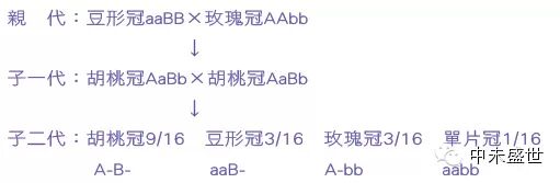 下面通过实例来探讨基因的相互作用。家鸡的鸡冠有以下几种类型:豆形冠、玫瑰冠、胡桃冠、单片冠。现用纯合子的玫瑰冠和纯合子的豆形冠杂交,它们都是纯合子,也都能真实遗传。经过杂交后子一代既不是豆形冠,也不是玫瑰冠,而是胡桃冠;子一代自交,在子二代中出现了9 / 1 6胡桃冠,3/16豆形冠,3/16玫瑰冠,1/16单片冠,作图如下: