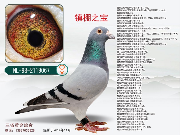 (二)三省黄金鸽舍主人,陈二双(名丽华),兄大双(名庭华)彝族子弟,大学文化,前上几辈小商户耕读人家。民国没落,解放后,父辈憨实,教子做平常人,说老实话,自尊自立,不卑不亢,读书只求明理,不捧红踏黑,田园养静,闹市无呻,不张不驰,有礼有度,看贵富是浮云,家运前生定,平常是大福,享福莫折福,摊上一羽好鸽子则福气也。 启棚于1980年,一直没有中断过养鸽,早年忙于生计,鸽路苍茫,不能入正轨,地方赛鸽成风,把援滇知青从上海带来的雨点称为神鸟,能在云南的山区飞300公里当日归的当作一件了不起的奇事。我弟兄俩,重随成年人养鸽,曾经差点把学业都荒废掉,赶紧刹车。自认为养鸽是成年人娱乐的事,青少年不能玩物丧志,养鸽的情趣,过格了就会成瘾,啥事都不会用心,过去养鸽的成年人大多穷,但鸽瘾却少见的大。能把五只鸡、一头牛羊换一羽鸽子的事我都做过。 十五岁上下,一位叫周明四的教师身份的老鸽友,对我们想创第一的疯狂的心情,做了这样的评价“两兄弟如果把对鸽子的兴趣,转向学习或者学门手艺,可能在这座城市里面,会被你们的意志所征服,创造一番事业,比你们拿鸽子的第一,更有价值。你们父母亲,会因为你们这对儿子而感到骄傲……”中肯的话情真意切,使我惊奇而感动。玩总不是一个最后的结果吧,鸽子虽然迷人,但当不了饭吃,加之居住的环境也没有能养一百羽鸽子的条件与经济。我们年少有这样自知之明,太难得。停下只养十羽,弟兄坚定了信念,怀着异样的心情,远远的看着成年人玩鸽赛鸽的恬静。 说句实在的话,我嫉妒他们有家有屋有好鸽子养,能够在自己的屋顶上开个老虎窗,让自己的爱鸽自由的进出,那真是美想,我也妄想有一日我长大了能参加工作挣到钱,多想拥有这一切,那我就做一个真正的养鸽人。 岁月如梭,改革开放以后,三十年我实现了我的梦想,全世界想往哪里飞就飞到哪里,只要爱的鸽子一定要拥有。地方赛的乐趣已经减退,公棚赛鸽成为了我实现少年梦想的战场,现棚内的几百只爱鸽,品系繁多,凡龙詹森是我的主流鸽系,红狐狸、桑杰士、海尔曼、速霸龙、利奥、公棚冠军赛绩鸽,原环进口欧洲名家明系,满棚皆是。已经不仅仅是为竞赛而收藏名鸽,准确的讲是为过去的梦想,大把的挥洒金钱,过去就因为缺钱,我有些报复式的恨钱而爱鸽。虽手中有够自己花销的金钱,不计划学明星歌星买飞机,买游艇,但百姓人家出生的子弟,知道日子漫长得很,要懂得节俭和具备正确金钱观念,买名鸽、看名鸽、赛名鸽研究各种名系的保种提纯,近亲繁育,不断地为了把自己的主力血系科学的注入活力。不停的引进中外名血赛绩鸽,与我的主力血系杂交是我的理想。 故:三省黄金鸽舍定名三省,则为詹森之谐音,又因爱生情,又谓一日三省吾身,过正矫妄而不行错,“黄金则物之贵品,世界通用货值,黄土生金则五行之合,前后相并则三省黄金鸽舍,即慕詹森家最好的组合。